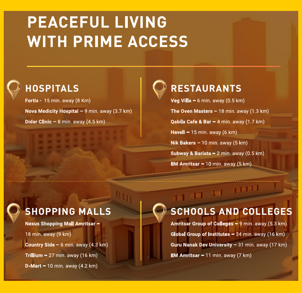 The upcoming “Delhi–Amritsar–Katra Expressway Spur” will soon connect Amritsar directly to Delhi, significantly cutting travel time and making intercity movement seamless for residents and businesses alike. Similarly, the “Amritsar–Jamnagar Expressway”, part of India’s grand industrial corridor, will link the city with Western India’s booming trade hubs — reducing travel time from 26 to just 13 hours. Surrounded by thriving development, high-end institutions, and NRI interest, “Amritsarr 1” stands in the heart of a rapidly appreciating real estate zone. With property values rising steadily, investors and homebuyers alike will find here not just a residence, but a rewarding growth opportunity backed by unmatched location advantages.